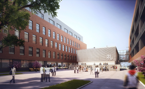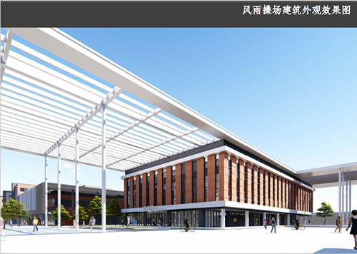 校园建筑立面风格以现代主义学院派为主,主色调为砖红色。在具体立面细节上整体与局部和谐统一,通过体量分解,开口布局,多种材料的组合,打造出一种既年轻活泼又稳重大方的建筑群体氛围。规划布局上采用主体传统教学布局“E”型的布置模式,保证所有教室南北向。屋顶局部设置太阳能板,利用太阳能光电技术为学校提供补充能源,充分重视可再生能源的利用。多种绿色建筑技术的综合运用, 将回中打造成生态化的绿色校园。在该项目的设计中所有教学用房朝向与通风俱佳,同时透过教学楼之间的架空层,最大化增进地面景观的开阔视野,绿色景致无遮挡引入校内庭院空间,创造了安静怡人、鸟语花香的校园生活环境。整体规划布局紧凑,各功能分区明确,流线凊晰,区域之间联系便捷,空间通透,朝向良好,我们希望,未来的回中远离城市的喧嚣,环境优美、功能合理、成为孩子们健康成长的快乐舞台。